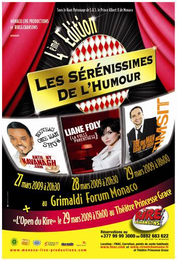 Avec Liane Foly et Patrick Timsit, il sera l’une des têtes d’affiche de l’édition 2009 des SERENISSIMES DE L’HUMOUR qui auront lieu les 27, 28 et 29 mars, organisée par Monaco Live Productions. L’inimitable humoriste dont la renommée a depuis longtemps franchi les frontières de son Québec est de retour en France avec son nouveau one-man show « Anthony Kavanagh.com ».