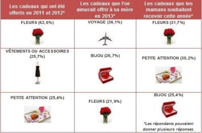 Les fleurs arrivent en tête du palmarès des cadeaux puisqu'elles sont à la fois attendues par les mères (31,7%) et quelles ont largement été offertes ces deux dernières années (56,2%). Autre valeur sûre: les petites attentions qui n'ont rien à voir avec l'argent, puisqu'il s'agit d'un petit déjeuner au lit ou d'un câlin par exemple. C'est ce que 30,2% des mères souhaitent recevoir en 2013 et 26,7% de ceux qui les aiment, indiquent leur avoir offert pour la Fête des mères en 2011 et 2012.