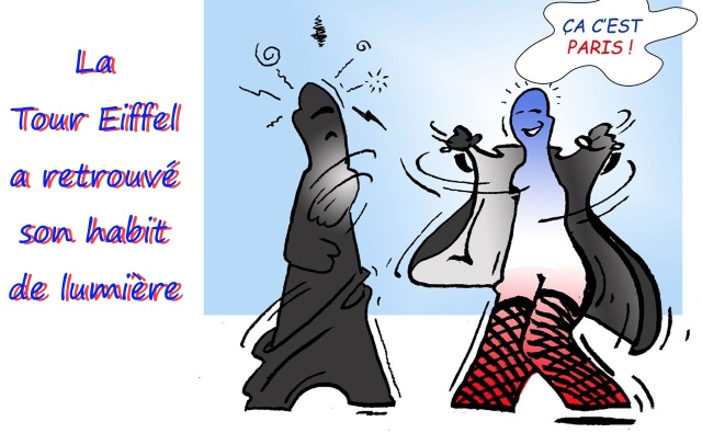 La Tour Eiffel s'est vêtue des couleurs du drapeau français dès lundi 16 novembre 2015 et restera illuminée en bleu-blanc-rouge jusqu'à mercredi soir, prouvant que "la ville des lumières" brillera, même dans l'obscurité cérébrale des barbares...