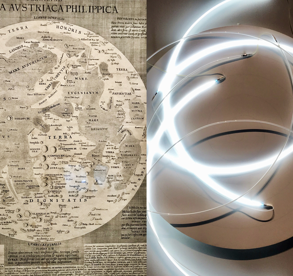 Puis, Galilée peut observer et dessiner ses cratères, ses montagnes et ses mers, carte qu'il publiera dans "Sidereus Nuncius" le "Messager céleste" en 1610. Six ans plus tard, il dessinera les différentes phases de la lune et il découvrira que cet astre n'est pas parfait comme le voulait la théorie aristotélicienne. En 1943, James Turrell réalisa une série de photographies déjà très précises du relief topographique de la structure lunaire.