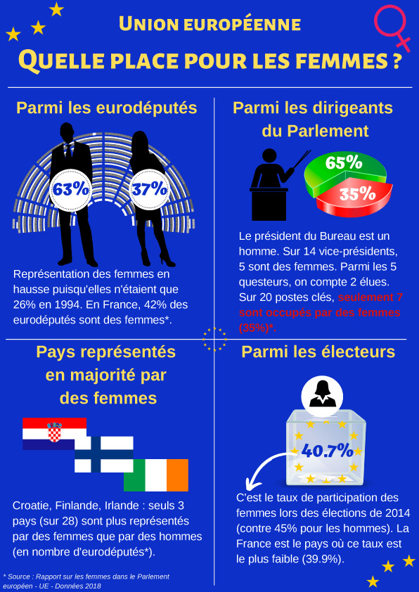 Même si la situation tend à s’améliorer, l’évolution est lente et les chiffres témoignent du retard pris par l’Union européenne en la matière. Au-delà de la sous-représentation parmi l’ensemble des eurodéputés, seuls trois pays comptent une majorité de femmes parmi leurs élus. Autre fait marquant : la faible représentation féminine au sein du "bureau", organe dirigeant du Parlement.