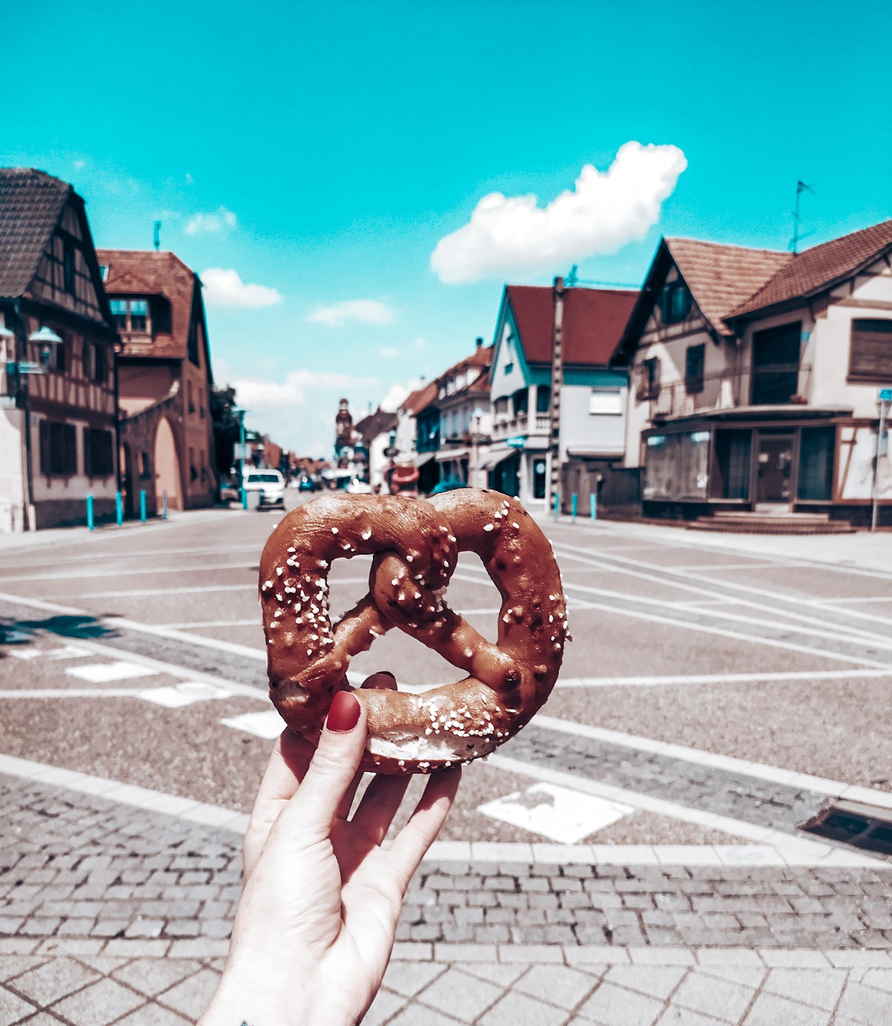 En voyage en Alsace, outre l’architecture, les maisons d’époque fleuries et et décorées, j’ai pu y découvrir une gastronomie étonnante et riche en saveurs! Le bretzel en fait partie! En effet, je m’étais toujours demandé quel était le goût de ce produit allemand, fleuron de la Fête de la bière. N’étant pas de la région, je me représentais le bretzel comme les croquants que l’on trouve dans les boîtes de gâteaux pour l’apéritif. Je ne me serais pas nécessairement jetée dessus si sa taille et sa forme de gros coeur entrelacé ne m’avaient intriguée. Et quelle surprise!