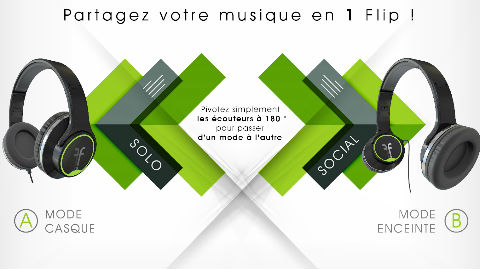 Flips audio se démarque dans un marché arrivé à maturité et ultra-concurrencé par l’originalité de son concept. Pas d’application nécessaire à son bon fonctionnement, passage d’un mode à l’autre via une simple rotation des écouteurs. Un système d’amplification unique permet de profiter du son HD de Flips audio en mode enceinte comme en mode casque.