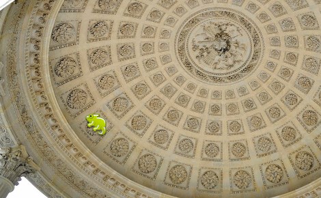 Notre aventurier s'appelle Léon Camay. Il participe à tout et à n'importe quoi, au gré de vos envois d'images. Et comme un vrai caméléon, il se fond dans son environnement. A vous de le retrouver dans cette photo où il observe de près la coupole du Temple de l'Amour au Petit Trianon à Versailles, en France.
