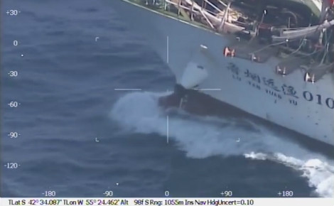 Le navire chinois dans le viseur des gardes côtes argentins. Capture d'écran de la vidéo de la Préfecture navale argentine montrant l'opération.