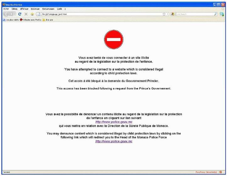 La page qui s'affiche en Principauté de Monaco, lors d'une tentative de connexion aux sites pédopornographiques