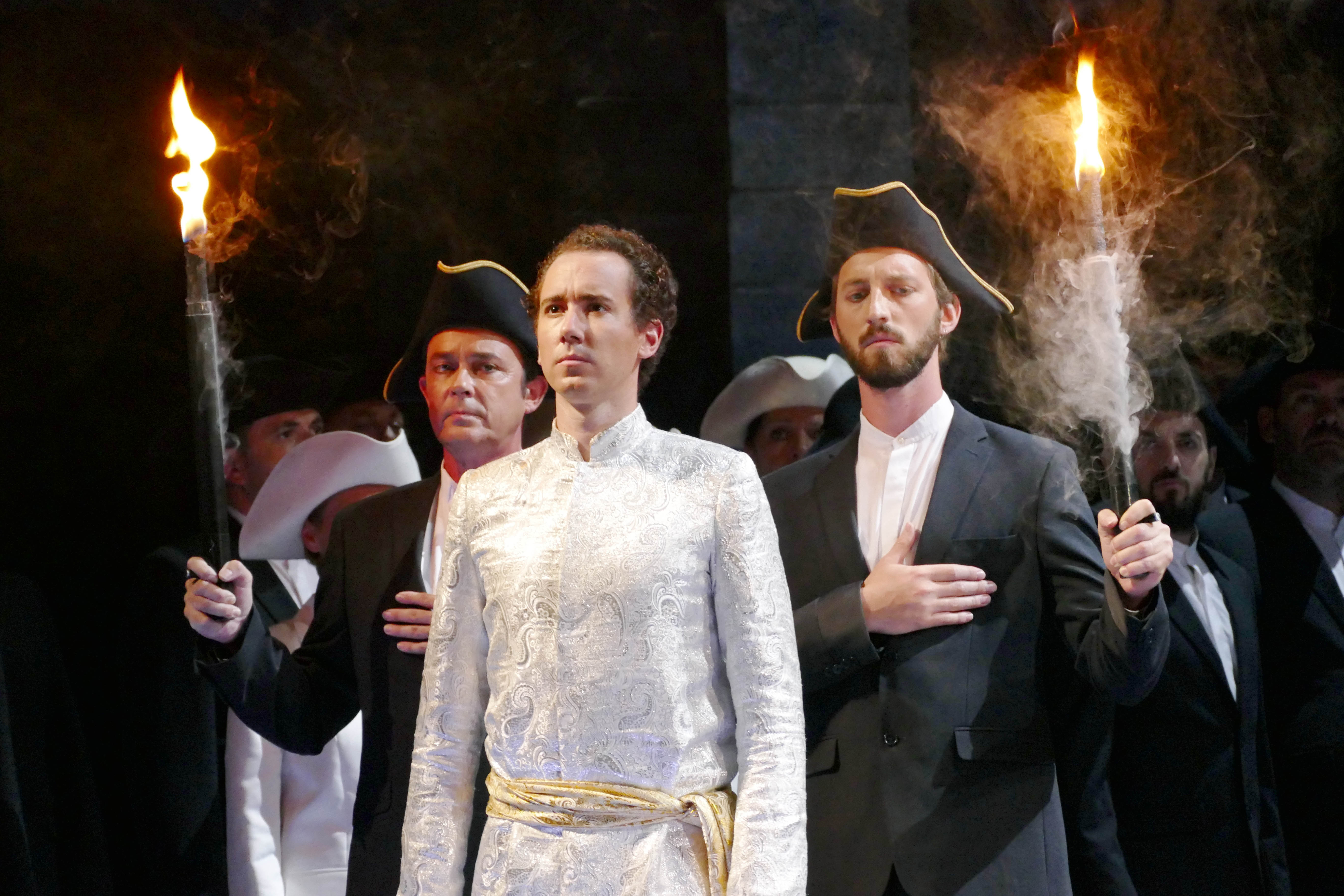 Très belle homogénéité chez les Trois Dames (Constans, Zerari, Roche), superbe choral des Hommes Armés (Guilhem Worms et Christophe Berry, uniques, grandioses !), des enfants sympathiques mais pas toujours dans la portée, Monostatos percutant et libidineux de Loïc Felix et orateur parfait, simplement parfait dans son éloquence, de Fréderic Caton.