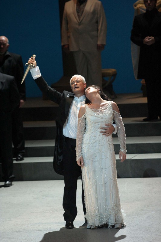 Réglée par Yves Coudray (qui ne méritait pas ces quelques huées d’une clique conservatrice en mal de péplum de sous préfecture) elle donne soudain une dimension insoupçonnée à ce loukoum indigeste. Quelques colonnes, autel, escaliers, des éclairages au scalpel signés par Philippe Grosperrin, suffisent à brosser le cadre du drame.
