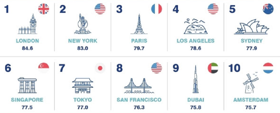Londres enregistre des perceptions de marque plus fortes que toute autre ville de l'étude. David Haigh, Président-Directeur Général de Brand Finance l’explique ainsi "sa performance exceptionnelle peut être attribuée à sa notoriété mondiale. Un énorme avantage sur ses concurrentes, qui lui permet de se classer en tête du classement. Connaître une ville permet au public de former des perceptions positives à son égard de reconnaître sa réputation et de la considérer comme l'endroit privilégié pour vivre, travailler, étudier, prendre sa retraite, visiter ou investir (...)"