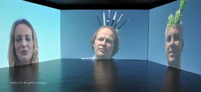 b [le premier]b, un grand espace vidéo et sonore où la restitution se déroule au travers de trois grands écrans placés en U. Ainsi, le spectateur a le loisir de se retrouver au centre du dispositif.