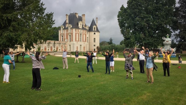 Les participants ont d’abord été invités à pratiquer devant le Château de Selles-sur-Cher, les fameux Huit pièces du brocart (Baduanjin), exercice mythique de bien-être dont la pratique est largement répandue en Asie sous différentes formes. La base de cet exercice rejoint la vision de l’unité du corps, de l’esprit et de la spiritualité. Cet exercice permet selon les traditions chinoises de faire circuler le qi (énergie vitale) dans le corps et l’esprit afin d’améliorer le fonctionnement physique globale.