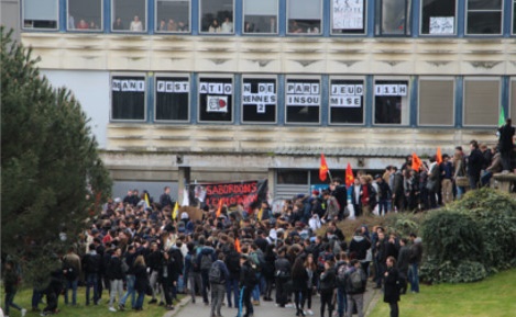 Les grévistes préparent la manifestation qui doit partir de Rennes 2 à 11h. Ils organisent des groupes pour aller débrayer les lycées des alentours afin de former un cortège étudiants et lycéens pour se rendre au rendez-vous fixé par l’intersyndicale à 12h place du parlement. Les grévistes, prévenus par sms par des camarades, savent déjà que de nombreux camions de CRS les attendent dans le centre ville de la capitale bretonne. Cette après-midi, le ministre de la Défense et président de la région Bretagne Jean-Yves Le Drian sera à la préfecture de Rennes.