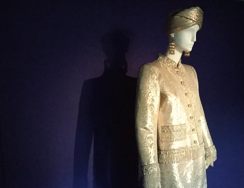 Nous voilà tout d’abord devant des modèles inspirés de vêtements traditionnels indiens. Un set de costumes de mariage pour les enfants d’honneur, puis la robe de mariée. "Le style rappelle l’Inde du Maharajah, avec broderie, dorures et perle", explique-t-on. Inutile de demander à quel moment Yves Saint-Laurent a voyagé en Inde, on nous rappelle que pour trouver l’inspiration, il s’est plongé dans les livres, les films, les objets d’art et son imaginaire. Inutile également de chercher à savoir de quelle région d’Asie proviennent les tissus, ils sont tous français et ont tous été tissés… en France. Un principe pour le couturier, adepte de la création "à la française".