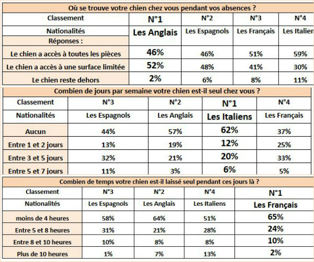 La relation entre les Français et leur chien n'est pas optimale. Alors que les Italiens sont 62% à ne jamais laisser seul leur chien à leur domicile, les Français sont seulement 37%. Les Anglais sont également très présents (57%) juste devant les Espagnols (44%).