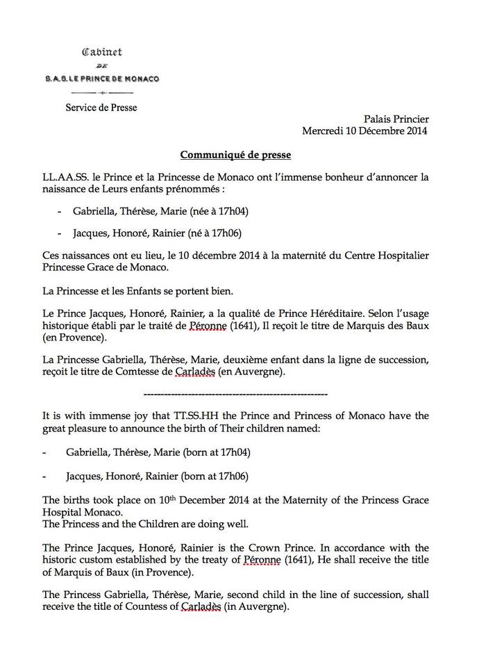 Les jumeaux princiers de Monaco sont nés  10/12/2014